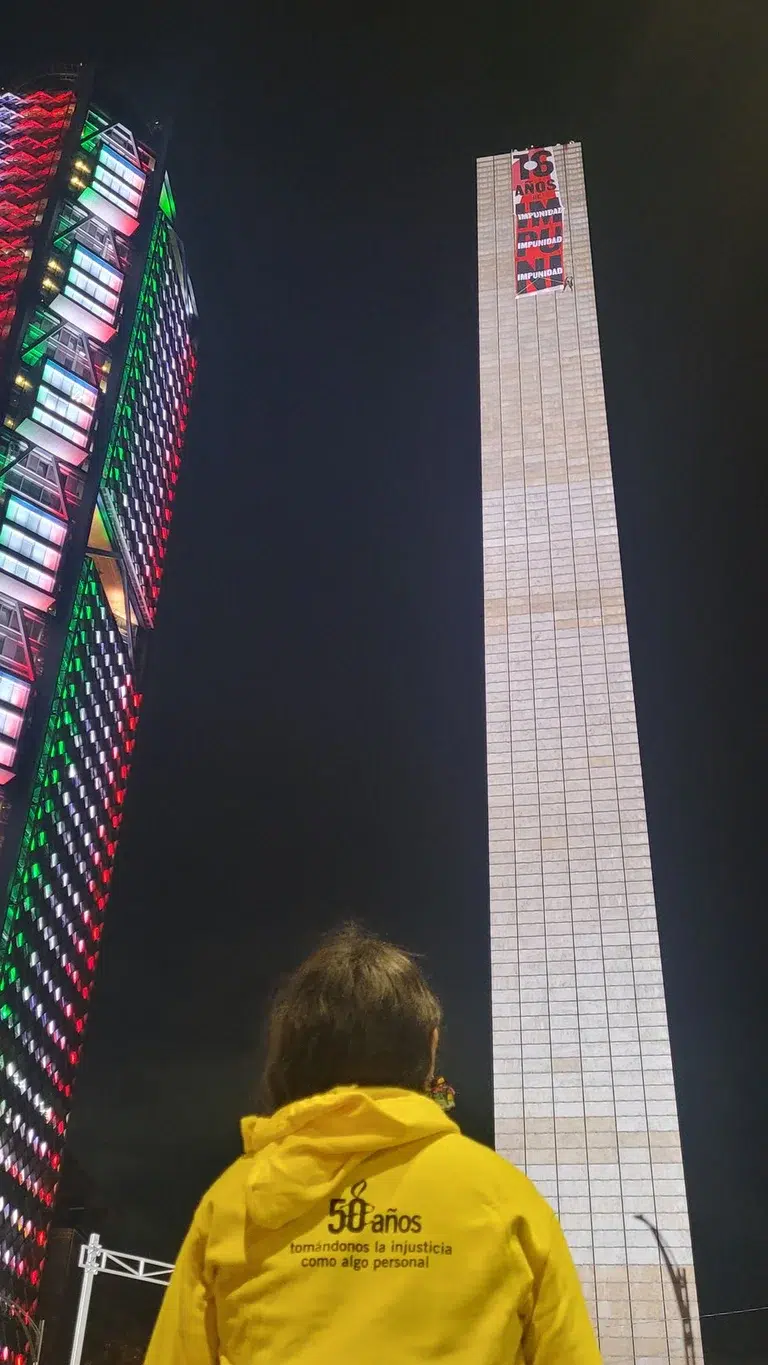Luego de 17 horas de arduo trabajo, integrantes del Colectivo Hasta Encontrarte lograron llegar a la cima de la Estela de Luz para desplegar una manta que pesa 80 kilos y mide 100 metros, en ella protestan contra las desapariciones y la “militarización” en el país.