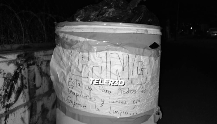 Cabe señalar que al exterior del tambo donde fue encontrado el cuerpo se localizó una cartulina pegada con cinta adhesiva, la cual está firmada por «CJNG».