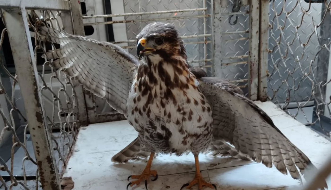 De acuerdo con el informe, el halcón fue localizado inicialmente sobre un árbol de aproximadamente cuatro metros de altura. Sin embargo, al intentar su aseguramiento, el ave levantó el vuelo y descendió hacia un vehículo estacionado, donde buscó refugio en la parte inferior.